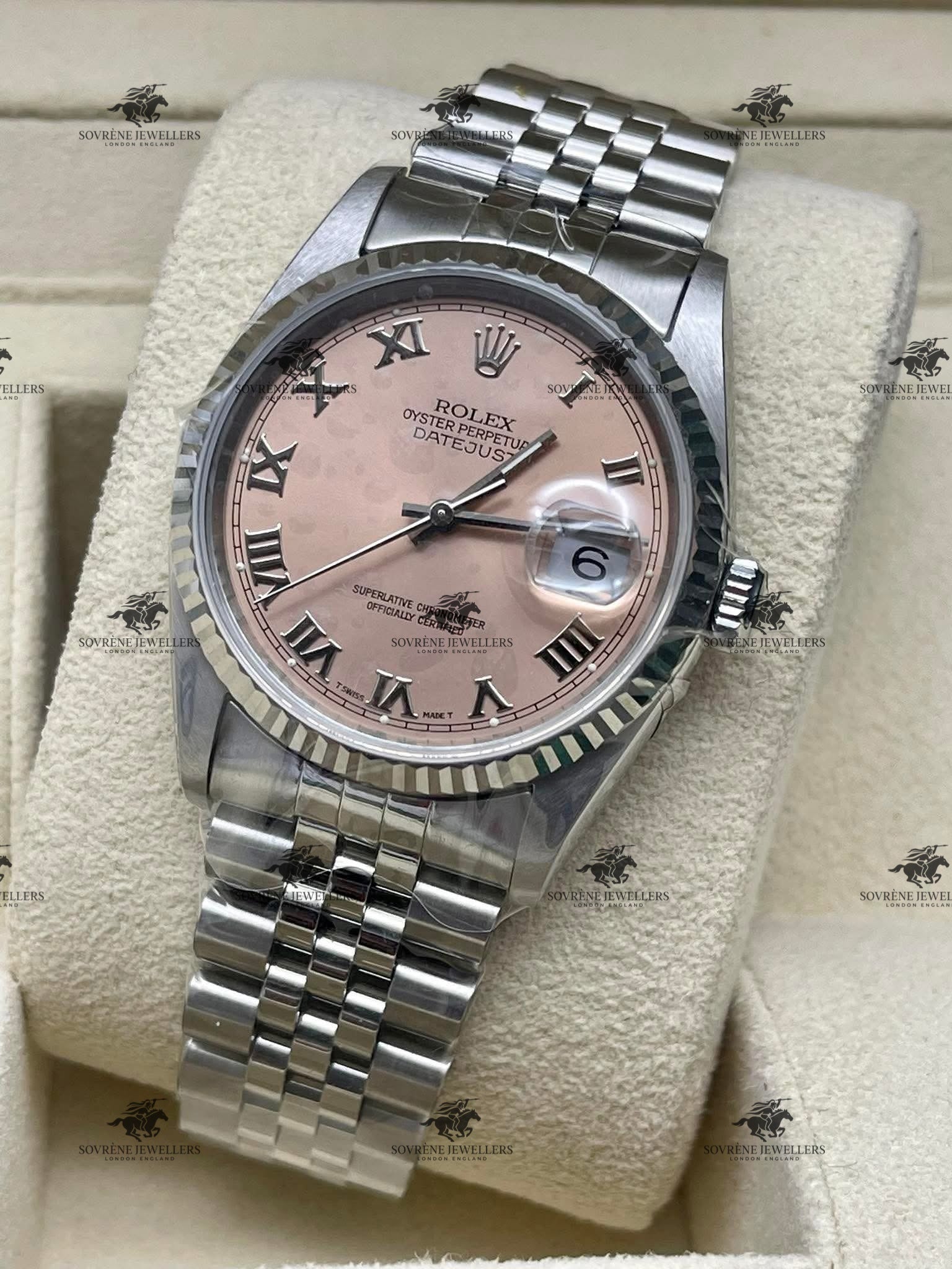This stainless steel model features a unique pink dial with Roman numerals, complemented by a classic fluted bezel. The Datejust offers a date display at 3 o'clock, providing practicality without sacrificing style. With its robust automatic movement and Oystersteel case, this watch is perfect for daily wear, while the Jubilee bracelet adds comfort and sophistication.
