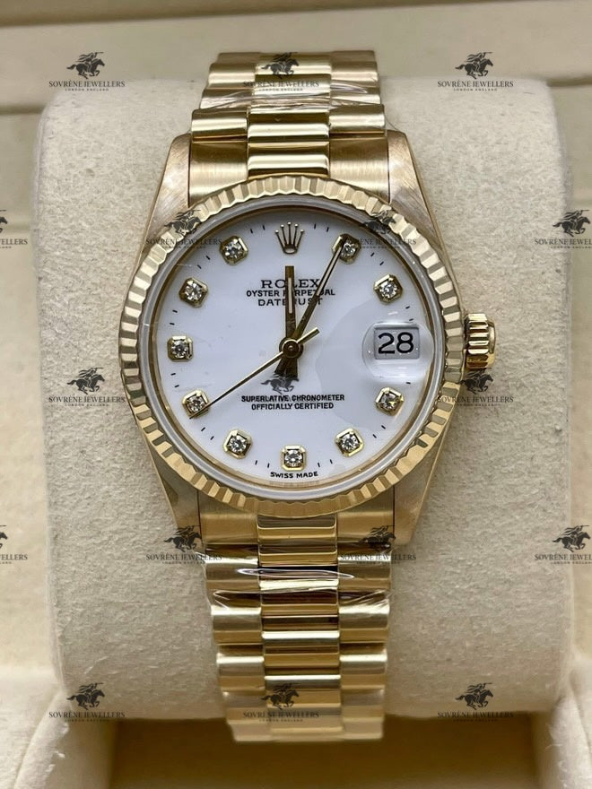 - Dial: White with factory-set diamond hour markers