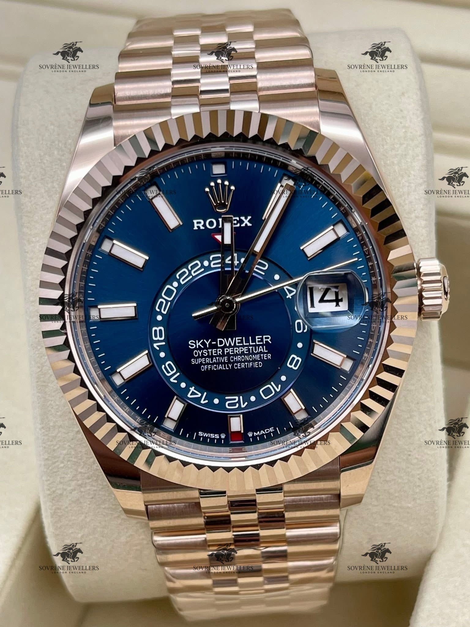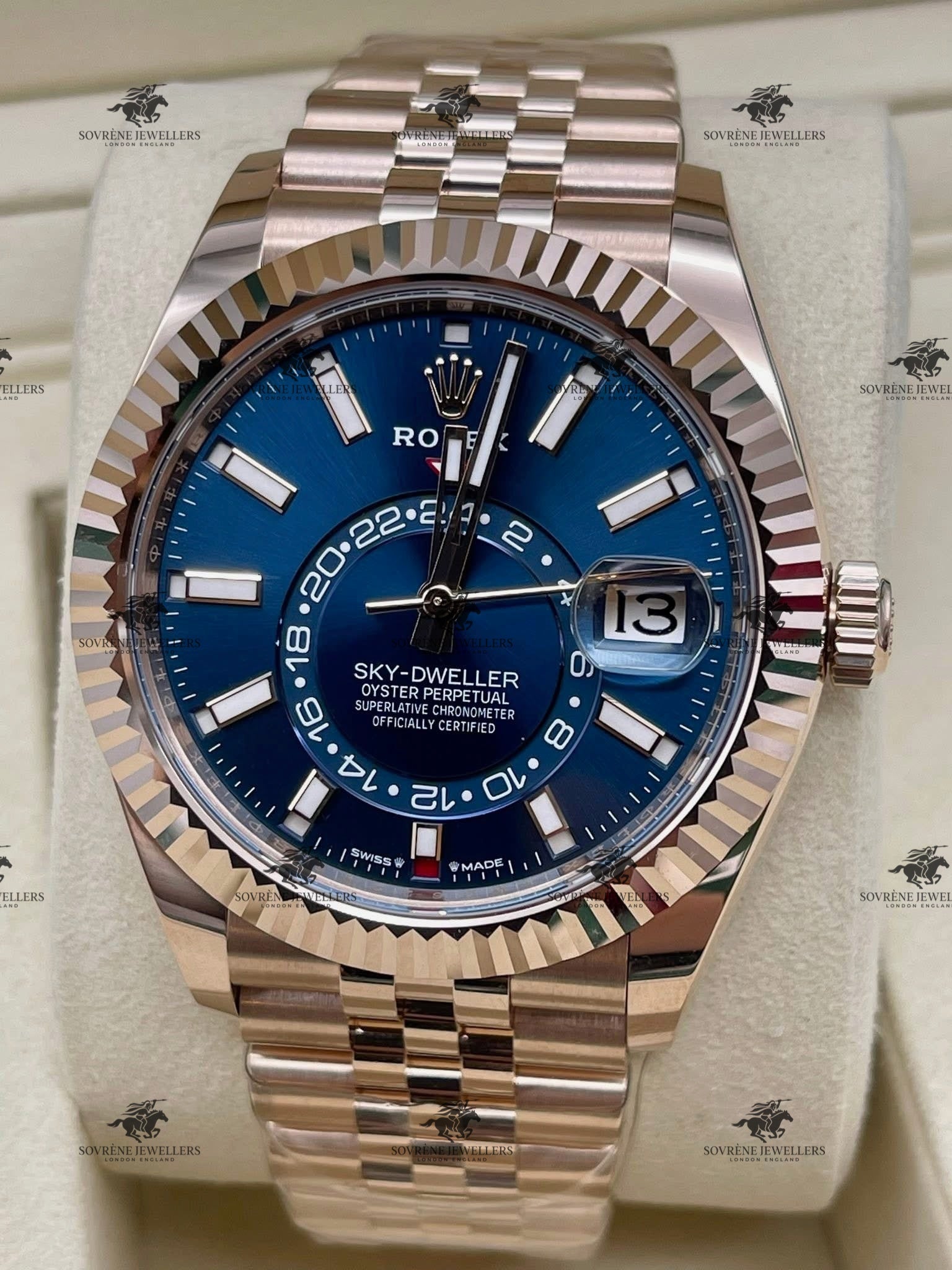 Authenticated and curated by Sovrène Jewellers London, this Rolex Sky-Dweller Everose Gold Blue Dial delivers technical mastery, global functionality, and unmistakable luxury in one of Rolex’s most coveted modern timepieces.
