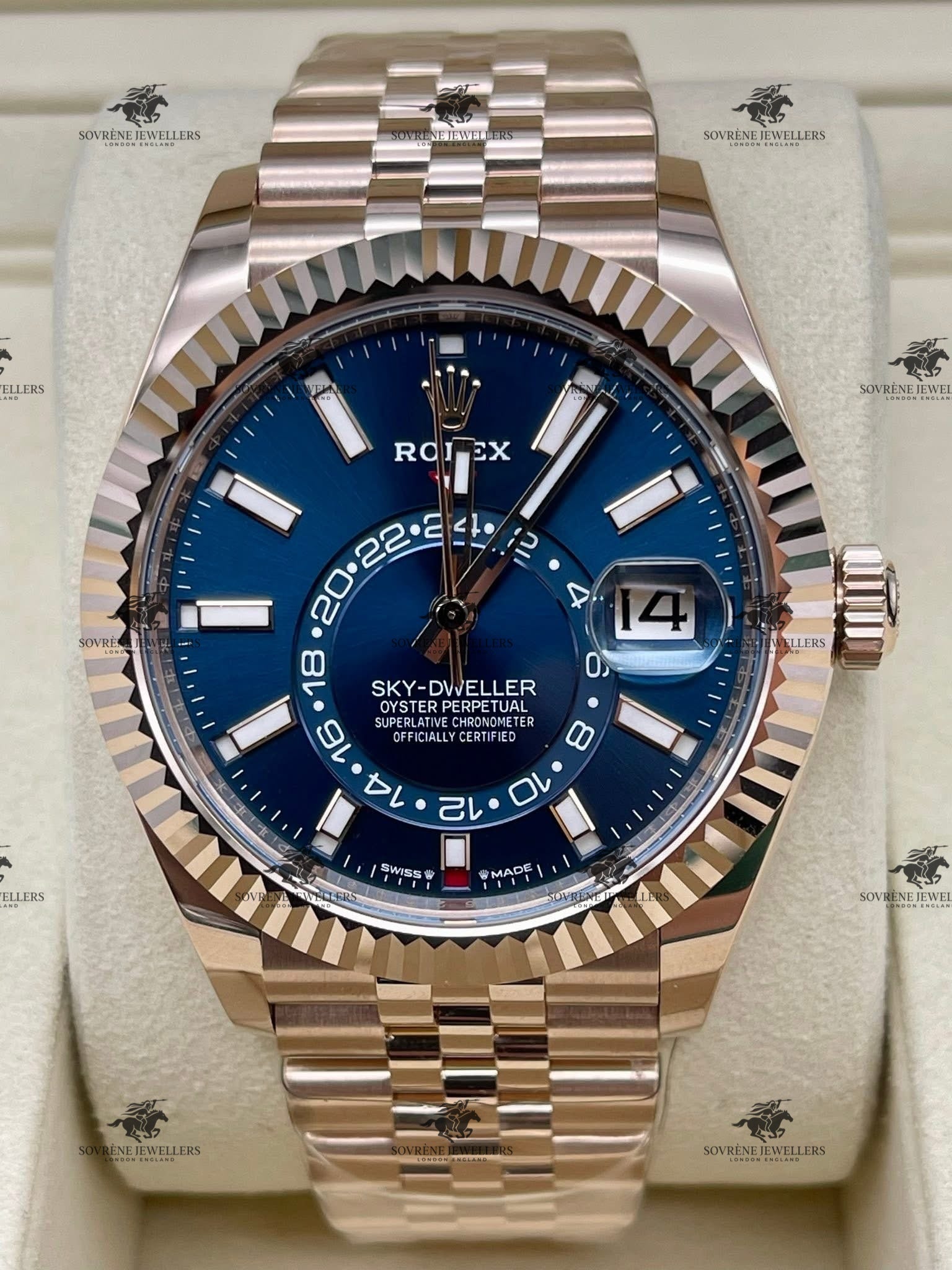 Pre Owned Rolex Sky-Dweller 18ct Everose Gold Blue Dial Ref 336935 | Sovrène Jewellers London | Authenticated by Sovrène