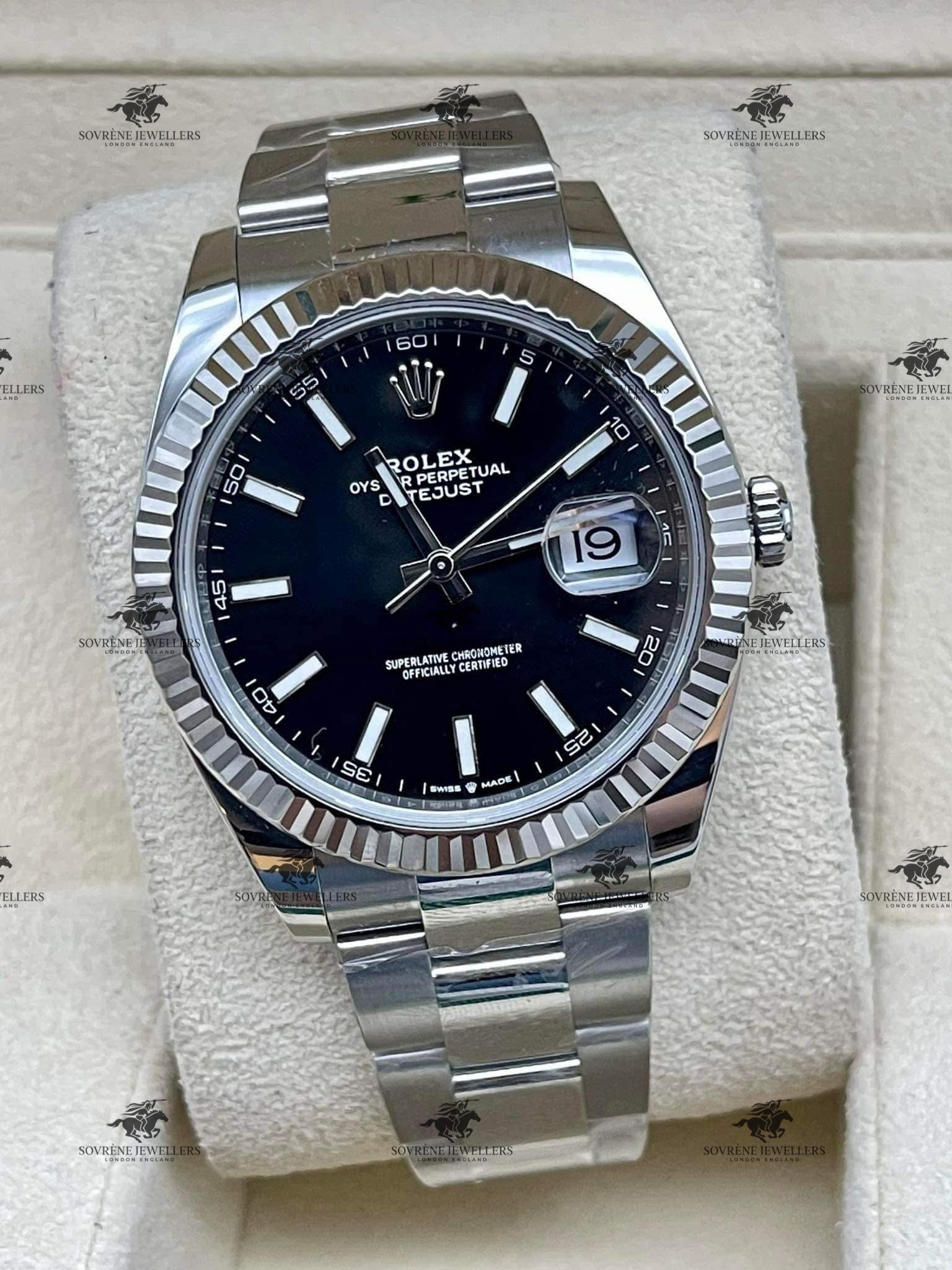 This refined example features a deep black dial with luminous baton hour markers, framed by the instantly recognisable white gold fluted bezel. The 41mm Oystersteel case delivers a strong yet elegant presence on the wrist, while the iconic Cyclops lens magnifies the date display at 3 o’clock for enhanced legibility and classic Rolex identity.